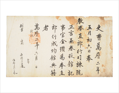 고신告身은 조선시대에 1~9품 관원에게 품계와 관직을 수여할 때 발급하던 임명장이다. 내용을 보면 ‘이조만력이년오월초육일吏曹萬曆二年五月初六日 봉교봉직랑행사간원정언겸춘추관기사관김찬위봉직랑행성균관전적奉敎奉直郞行司諫院正言兼春秋館記事官金瓚爲奉直?行成均館典籍’이라고 기록되어 있다. 즉, 왕명을 받들어 눌암 김찬金瓚을 성균관전적成均館典籍에 임명하였다는 내용이다. 당시 김찬의 관직은 사간원 정언 겸 춘추관 기사였다. 김찬의 본관은 안동이고 자는 숙진叔珍이며, 호는 눌암訥庵이다. 조선 개국공신 익원공 김사형金士衡의 7대손 참의공 김언침金彦沈의 셋째아들이다. 1567년(명종 22)에 진사가 되고, 1568년 식년 문과에 을과로 급제해 여러 관직을 두루 역임하였다.