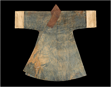 장옷長衣은 치마저고리를 입은 후 겉에 입는 조선시대 여성의 가장 대표적인 외출복이다. 이 유물은 소렴에 있었던 겹 장옷으로 녹색이 뚜렷이 남아있다. 겉감은 구름무늬의 문능紋綾이고 안감은 성근 주紬로 만든 겹옷이다. 섶선 안으로 들여 달린 목판깃과 겨드랑이 아래 사각접음무가 달린 것이 특징으로 길감과 다르게 자주색 연화문단으로 장식하였다. 겨드랑이에서 이어지는 소매는 일자형이며 소매 끝에 흰색 거들지를 달아주었다. 현재 고름은 소실되어 달려있지 않다.