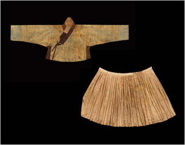 치마와 저고리는 여성의 대표적인 옷이다. 저고리는 깃, 곁마기, 고름을 자주색으로 사용한 회장저고리 형태로 겉깃이 모두 목판당코깃(여밈 끝이 버선코처험 뾰족한 모양의 깃) 양식이다. 소매의 모양은 겨드랑이에서 소매로 완만하게 줄어드는 일자형이며, 길(몸통) 부분의 옆선과 도련은 완만한 곡선이다.