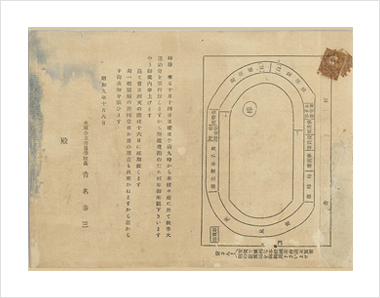 소화 9년(1934) 추계운동회 안내장이다. 수원공립보통학교장 답명태삼(沓名泰三)의 이름으로 발송되었다. 1929년 대운동회 안내장과 유사하며 군국주의적 성격을 띄고 있다. 운동회장 밖에 직업과 상업실습부의 판매대를 설치하여 이용을 권장하고 있다.