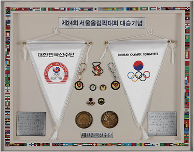 88올림픽 대한민국 선수단 로고, 올림픽 로고, 'Korea Olympic Committee'이 새겨져 있다. 아랫쪽 왼쪽과 오른쪽에 선수들의 사인을 새긴 동판이 배치되어 있다.